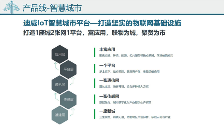 在新型智慧城市建設進程中,迪威迅依托IOT智慧物聯(lián)網平臺,通過物聯(lián)網、大數(shù)據(jù)、云計算、人工智能等新一代信息技術與城市基礎設施的創(chuàng)新與融合,助力城市智慧化升級。